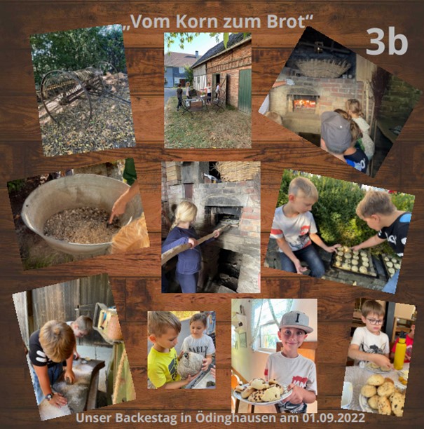 Am 01.09.2022 wanderten wir nach Ödinghausen. Dort steht ein alter Backes. Wir haben uns alte Geräte zum Ackerbau angeschaut und Getreidekörner mit Steinen zu Mehl gemahlen. Der Backes wurde mit Holzkohle Stunden vorher aufgeheizt. Er hatte zu Beginn eine Temperatur von 713 Grad. Die Kohlestücke wurden herausgeholt und in einer Zinkwanne zur Seite gestellt. Da hätte man noch Würstchen drauf grillen können, so heiß war die Kohle. Der Ofen im Backes musste auf 200 Grad abkühlen. In der Zwischenzeit haben wir fleißig herzhafte und süße Brötchen geformt. Dann trugen wir die Bleche zum Backes und schossen sie mit einem langen Schieber in den Ofen. Mmmmh - wie gut das duftete! Zum Schluss holten wir die fertigen Brötchen aus dem Ofen und trugen sie in die Scheune zum Frühstück! Das war ein herrlicher Backestag!