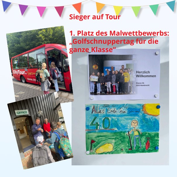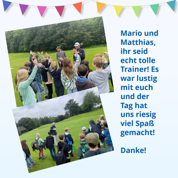 Am Mittwoch, 03.07.2024 lösten wir unseren Preis ein. Ein kleiner roter Bus holte uns in Nümbrecht ab. Gero, der Clubmanager, hieß uns herzlich im Golfclub Burg Overbach willkommen und überreichte uns kleine Säckchen mit Pitchinggabeln, Tees und einem Ballmarker als Begrüßungsgeschenk. Die Golftrainer Matthias und Mario der Golfschule novavital führten uns in den Golfsport ein. Auf der Drivingrange und dem Puttinggreen ging es motiviert und mit viel Freude an die verschiedenen Schläger heran. Mittags wurden wir von Micha und seinem Heubodenteam mit Currywurst, Pommes und einem Softgetränk köstlich bewirtet. Nach der Pause durften wir uns mit den Carts einmal die 12 anschauen und stellten fest, dass man echt weit schlagen muss, um da rüber zu kommen. Bei einem kleinen Dreierscramble in jeweils zwei Gruppen durften wir unser Können auf dem Kurzplatz unter Beweis stellen. Zum Schluss gab es noch Golfbälle für alle und der kleine rote Bus brachte uns wieder sicher nach Nümbrecht. Vielen Dank für einen tollen Golftag sagt die Klasse 4b der GGS Nümbrecht! PS: Einigen hat es so gut gefallen, dass sie sicherlich samstags mal beim Training vorbei schauen werden! Happy 40th Birthday GCBO!!!!