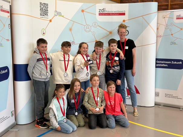 Ein spannender Tag für zehn junge Nachwuchs-Techniker aus der 2. und 4. Klasse: Unter der Leitung von Lehrerin Frau Klein nahmen sie am Zdi-Robot Performance Wettbewerb teil, bei dem es nicht nur um Informatik und Technik sondern auch um die Gestaltung eines Bühnenbildes sowie das Erzählen einer Geschichte geht. Die Kinder sind Mitglieder der Robotik-AG und haben mit großem Einsatz und Kreativität ihre Choreographie zum Thema Future Food vorbereitet und präsentiert.